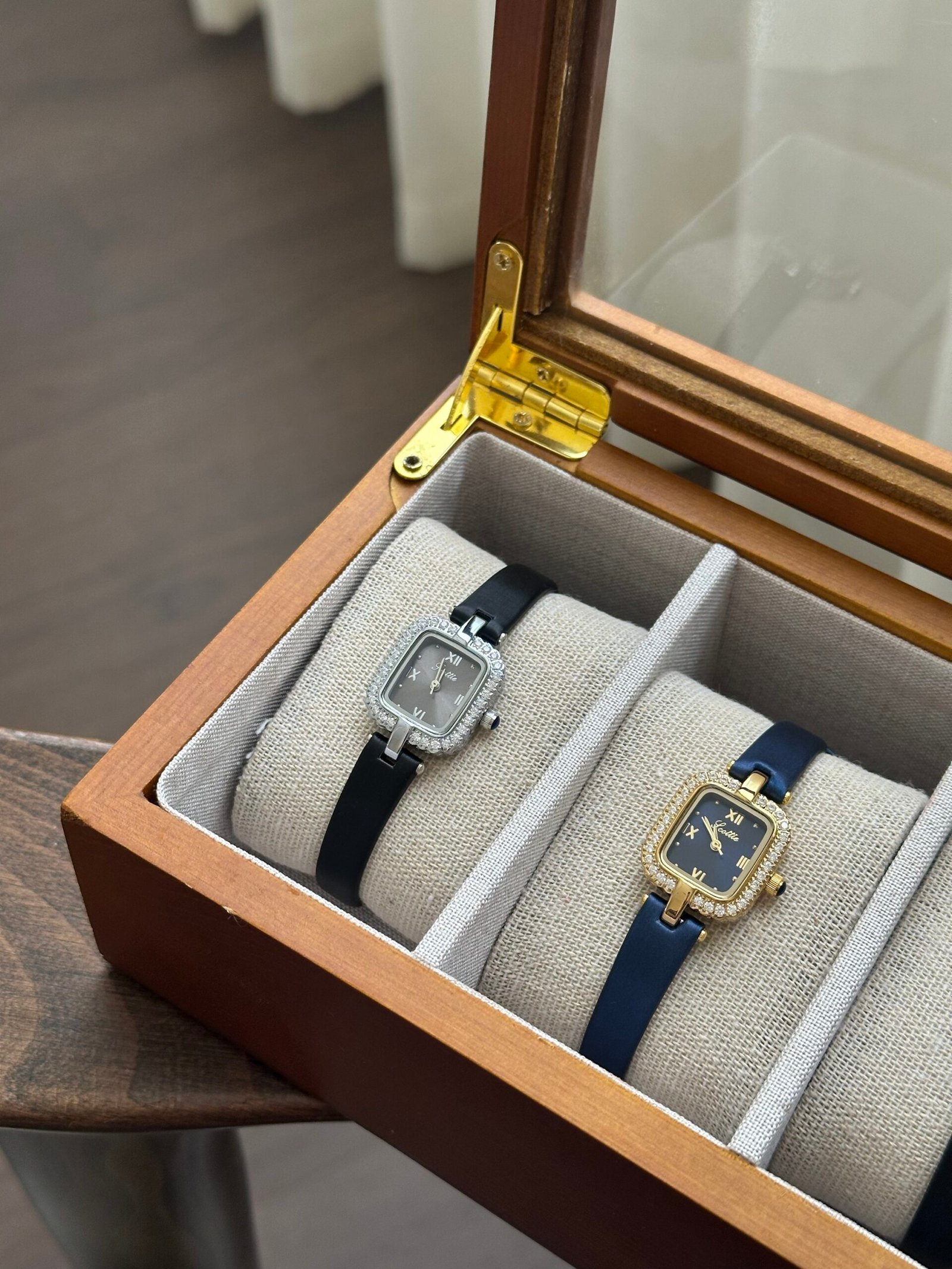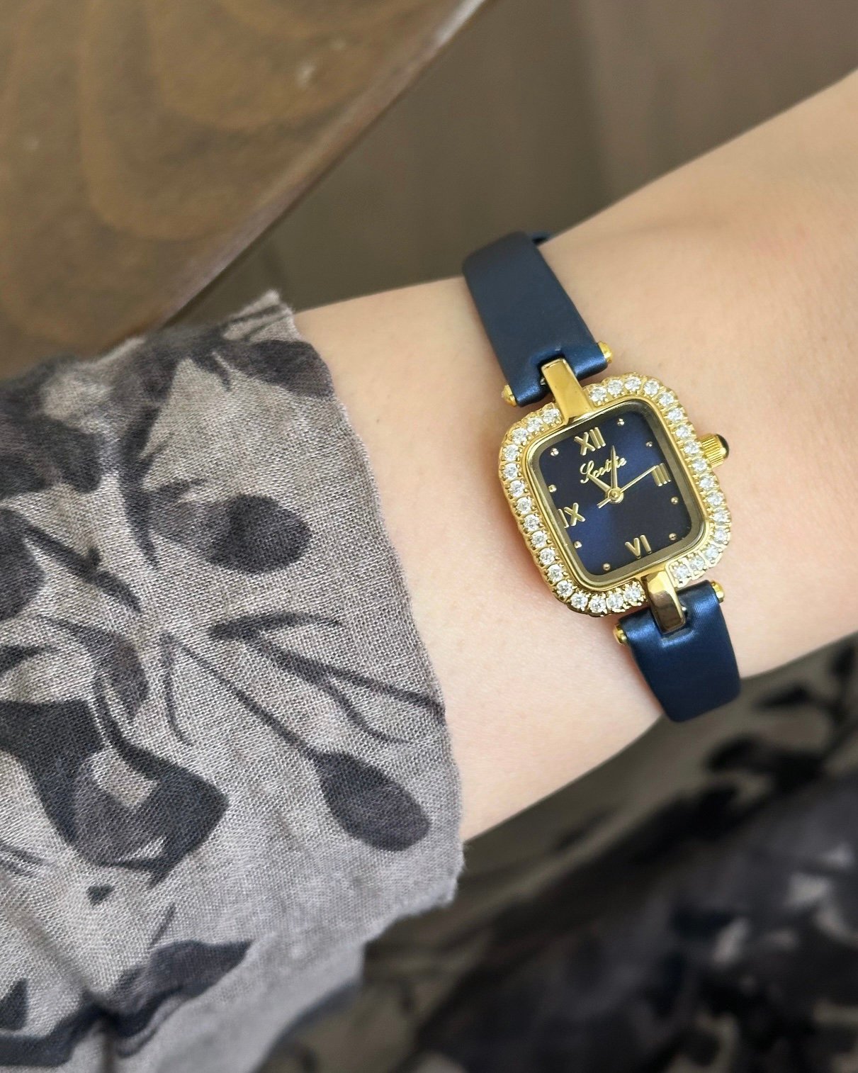 Elegant women’s watches with a luxurious satin leather strap and a jeweled bezel,