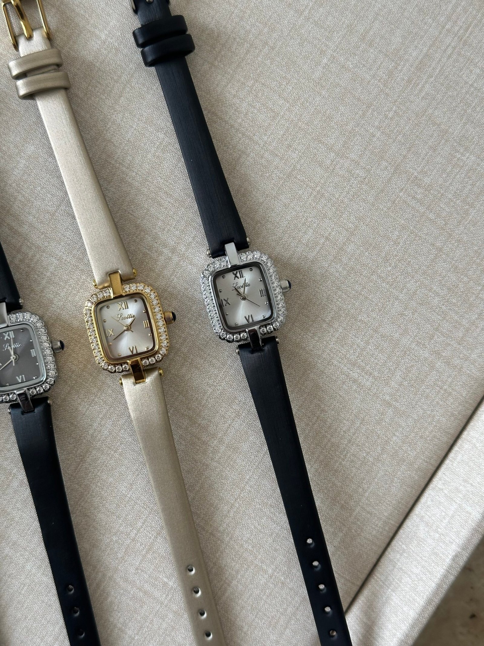 Elegant women’s watches with a luxurious satin leather strap and a jeweled bezel,